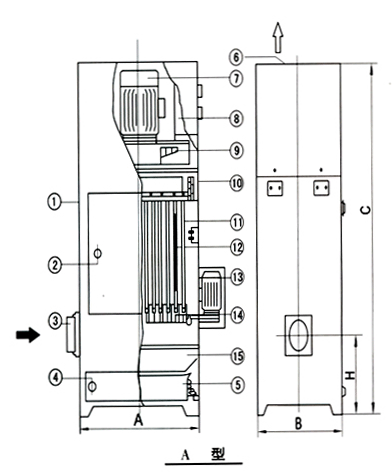 含塵氣體進入箱體,由扁布袋過濾器進行過濾,粉塵被阻留在濾袋外表面,已凈化的氣體通過濾袋進入風機,由風機吸入直接排入室內也可接管排至室外